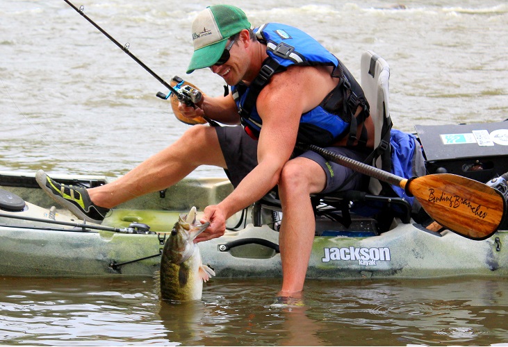 Tim Stewart, founder of the Hardcore Kayak Fishing Team and member of the Great Outdoor Provision Co. Fishing team, also recommends the SOT for rougher water. “It’s not like you can’t go offshore in a SIK, but nobody wants to wear a spray skirt, myself included,” Stewart states. “So, if you plan to go through the breakers or offshore, SOT is the choice.” (Stewart is shown below with a largemouth caught from his SIK)