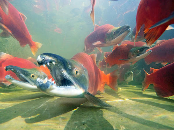 In September, kokanee — which are a shade of silver most of the year — change to a fluorescent red prior to traveling up rivers and streams to spawn. Their bright-red color makes the salmon easy to spot in the waters where they spawn.