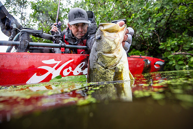 Is there a particular type of water where the Hobie IKE really excels? “It’s good anywhere; big water, small water, open water, back waters, even rivers and streams. On larger lakes and river systems, the stability really helps when the wind kicks up and the water gets a little nautical. I’ll push it wherever I have to go to get the fish, and I’ll use that MirageDrive pedal system to hold my position while casting in a hawkish wind. “That said, you just can’t beat this vessel in places that have current. I grew up trout fishing on the tidal Delaware River, so I really enjoy working eddies and seams. I love how the fish set up in those places and my Hobie is an amazing tool for working them properly because it lets you easily tweak and hold your position. Going back to the idea of simple access, some of the best waters on small streams and rivers are hard to reach with a bigger boat, but they pose few problems in my Hobie. Once you get out there, the MirageDrive 360 system is just a huge advantage because you can use it to stay indefinitely on the best edges, seams and breaks. “The Hobie Kick-Up fins also make this kayak unbeatable for stream and river fishing. There are times when you get into an uncontrolled situation – like when going downstream or fighting a big fish – and get off kilter. If you end up smashing into a submerged rock, log or something, those fins simply kick out of the way and then pop back in place. You can also simply pull your drive out and then click it back in and be ready to go.” How do you like to approach current situations when bass fishing? “For bass, or any other fish that live in a current situation, everything revolves around that moving water. It provides food, so you have to learn how the fish position themselves in the seams, breaks and eddies. In general, bass like to be in areas of less current but with quick access to stronger current. That’s the epic break or seam better anglers are always talking about. I want to cast up-current to let my bait come back naturally in or around those seams. In low flow, the fish favor the fast side of the break and in high flow, they hold more on the slow side of the seam, but there are also days you’ll find them right in the middle so always keep searching and probing. With my Hobie, I can stay in place and work these seams right, go shallow if I need too, and make any adjustments necessary with my hands free. That’s a big advantage anytime you have to deal with current, wind, or both at the same time.” |