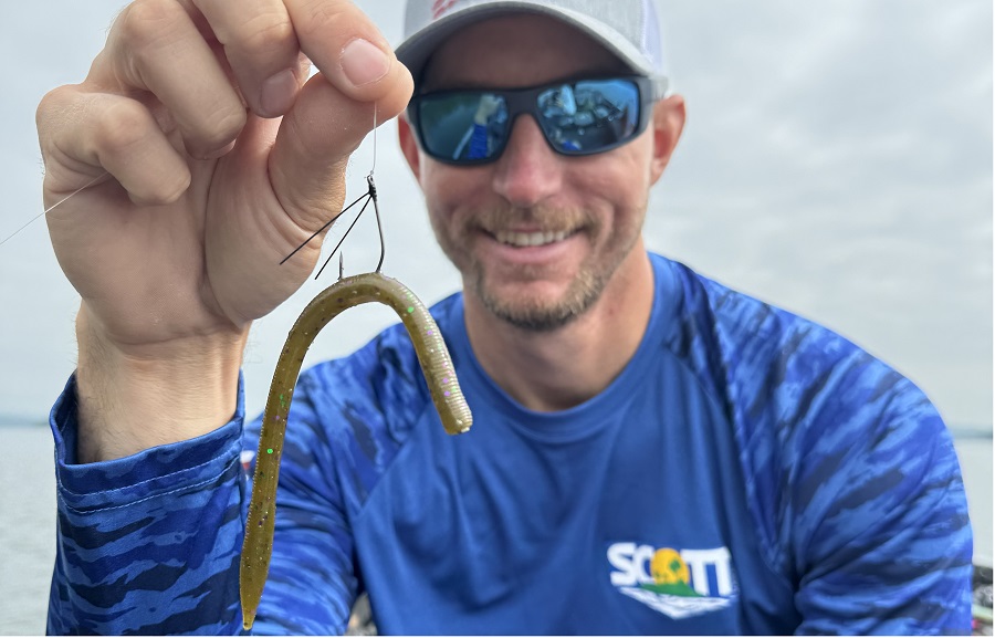 Becker said the worm's design helps it get great action as the bait falls and he works it back to the boat. "It's a little bigger than a standard Senko in length and much softer," he said. "They use neutrally buoyant plastic that will sink very slowly, which gives it an excellent action on a Neko Rig. It flutters and almost vibrates, which is all because of the worm design and plastic used."