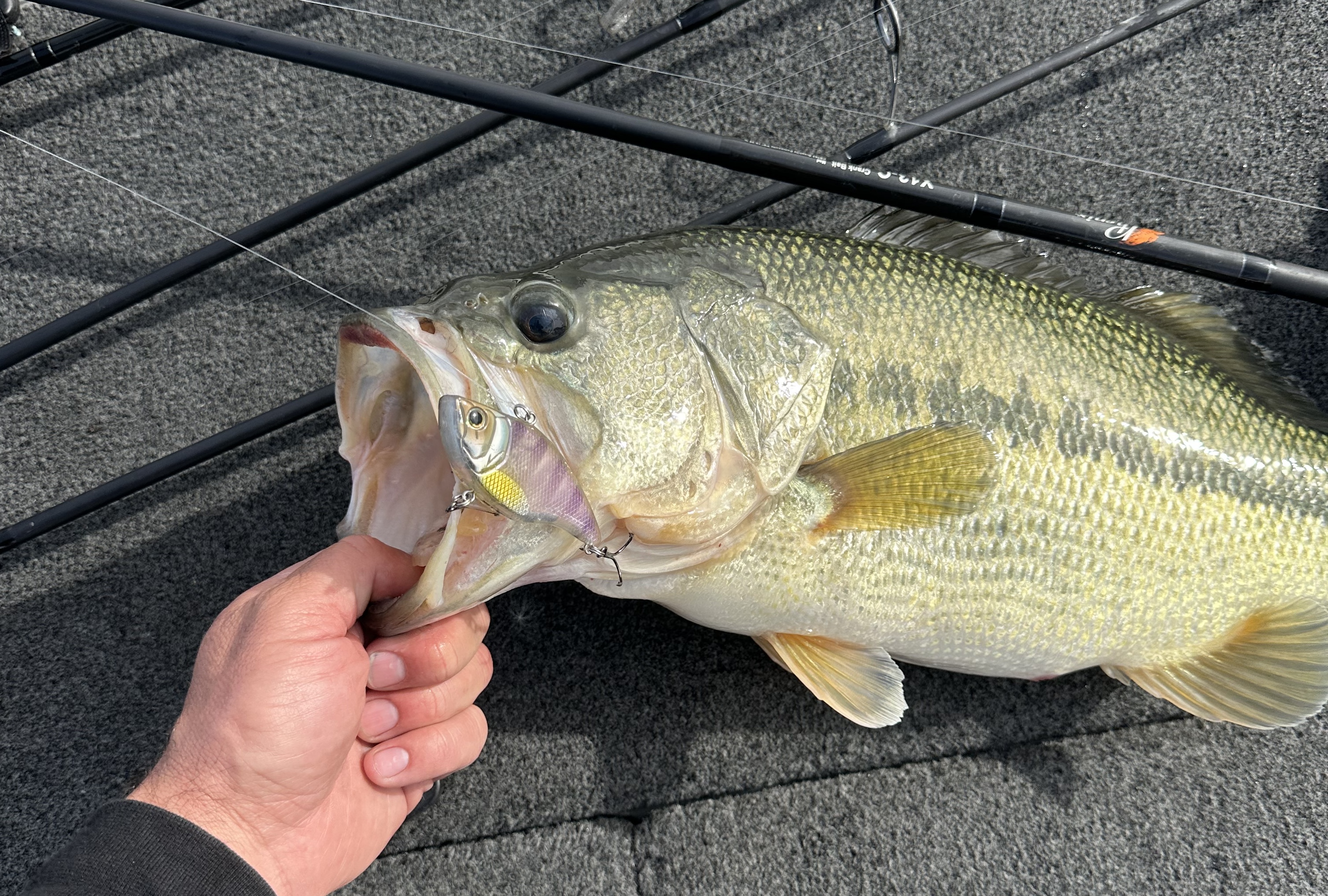 He keeps it simple with color and generally sticks with shad or bluegill imitators, but crawfish colors can also be excellent. He fishes these with a heavier fluorocarbon line and Phenix X-13 crankbait rod.