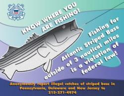 "It is illegal to possess or target the Atlantic striped bass in federal waters, which begin three miles from shore," said Lt. Cmdr. Patricia Bennett, the deputy enforcement chief for the Fifth Coast Guard District in Portsmouth, Virginia. "In state waters – waters less than three miles from the coast – each state has its own laws designed to protect stripers. Even though the Coast Guard does not enforce those state laws, if we find a violation at the state level, we may notify state authorities."