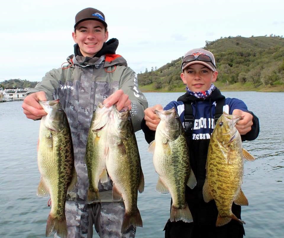 Photo Right: Freedom High School's Justin and Tyler Hurney with their 14.35 pound Berryessa limit that earned them High Scool Bass 2nd place.