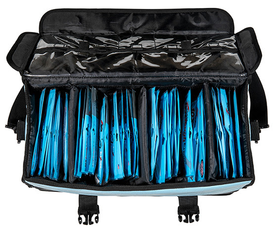 “As most anglers have learned, binder-style totes and other tacklebags offer a very limited—and often, disorganized— storage space for soft plastics,” says Z-Man president and expert angler, Daniel Nussbaum. “We crafted the Bait LockerZ first and foremost to make it super easy to finger-walk through dozens of bait packs with ease, allowing you to quickly access that hot shape and color in a seconds. Slide the package back in the LockerZ and your baits stay organized and in in tiptop shape for the longterm.” Tailored to precisely encase the width of standard-size 7-inch zip-lock bags of ElaZtech® or other baits, the Bait LockerZ includes four removable Velcro dividers, yielding five separate, personalized bait compartments. Bait bags stand upright, flat and organized, easily identifiable and accessible. The Bait LockerZ supports ElaZtech baits stored in their original packages, effectively preserving their natural, original shapes without compressing or deforming them. Comfortably housing up to 50 packs of ElaZtech or other softbaits, the LockerZ effortlessly transports more than enough baits for any tournament, weeklong vacation or daytrip. To lock water out and prevent the lid from blowing open, a tough, robust top enclosure stays shut, thanks to powerful magnetic flaps. This intelligent arrangement also provides easy-to-open, zipper-free access to your bait collection. During transport, dual snap enclosures further safeguard the LockerZ’ valuable contents. A rugged, rubberized bottom panel prevents moisture entry and grips all types of boat decks. A convenient lid handle and nylon shoulder strap ease bag transport. |