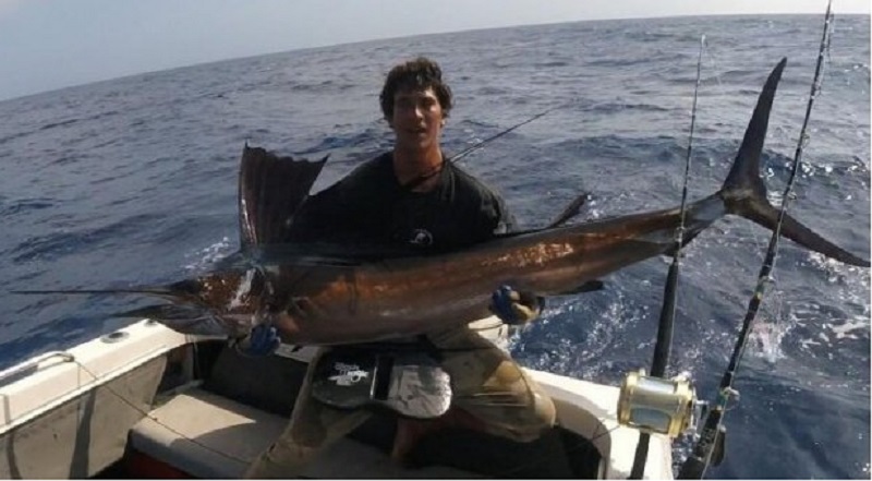 Having just released an estimated 250Kg blue marlin, Ross accidentally fell overboard in an attempt to retrieve a camera knocked from the boat’s gunwale.