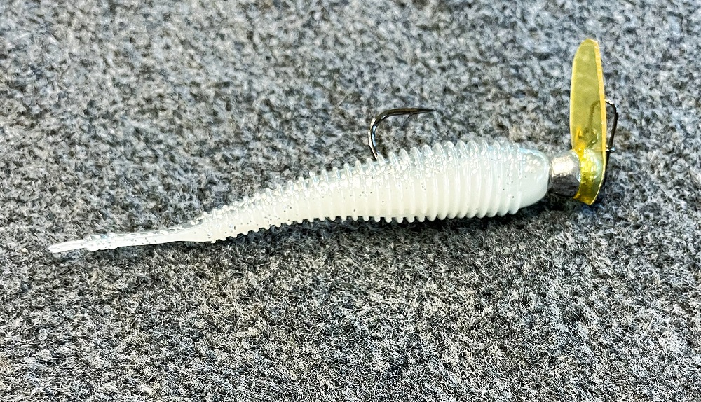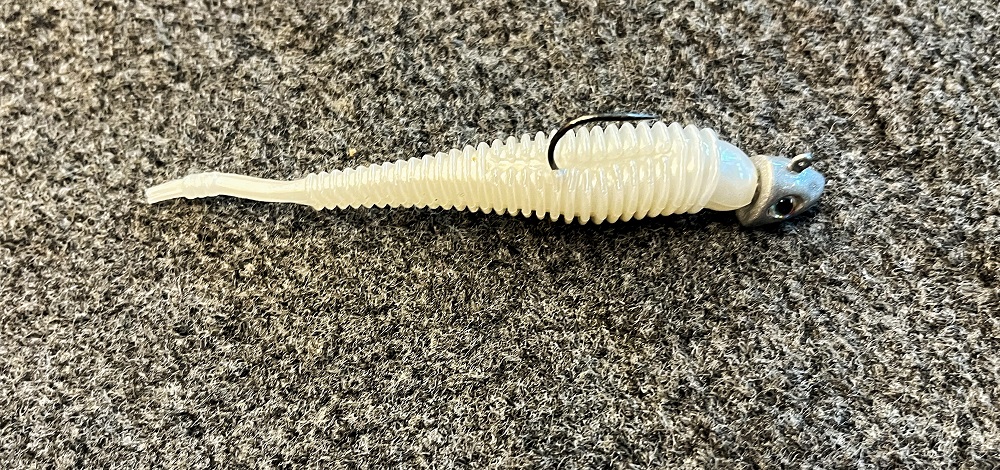 The Spunk Shad was originally designed to be fished on a Scrounger style jig head. The reason here is you do not want the soft plastic trailer on this style jig to overpower the action of the jig. A Scrounger style jighead has a plastic bill on the head of the jig to make the jig dart back and forth, perfect for copying the action of fleeing baitfish in the water column. By using a Spunk Shad as your trailer, it is along for the ride on the Scrounger, and is like the closer…if a bass is following your jig in and then sees that slight shimmy and movement from the ribbed body and pintail on the bait, that is when they commit and bite.