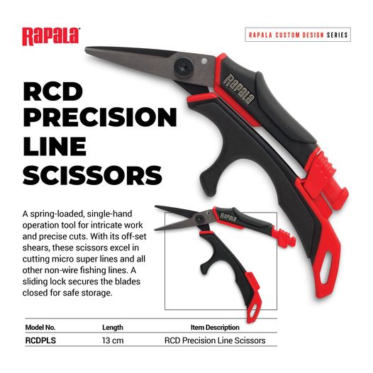 A spring-loaded, single-hand operation tool for intricate work and precise cuts. With its off-set shears, these scissors excel in cutting micro super lines and all other non-wire fishing lines. A sliding lock secures the blades closed for safe storage.RAPALA RCD PRECISION LINE SCISSORS