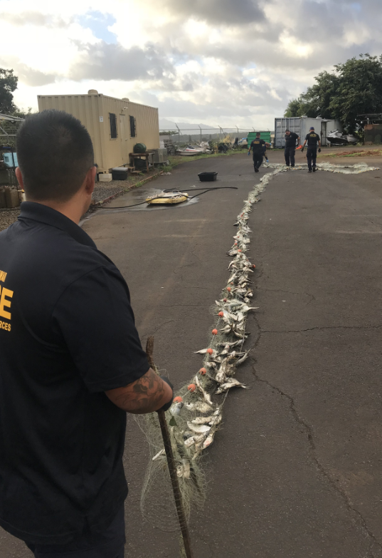 Officers detained two men who were observed tending the net. They are identified as 45-year-old Orlando Maiava of Hau‘ula and 45-year-old Clayton Espanto of Kailua. Maiava was cited on March 31, 2018 by DOCARE officers in the same area for lay net and throw net violations.