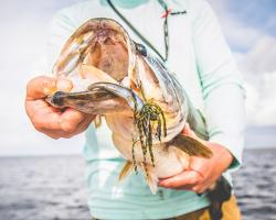It wasn't more than a few casts with the Project Z™ ChatterBait® Weedless paired with a DieZel MinnowZ™ trailer in the color "The Deal" when Luke hooked into a true lunker. Coming in at 9 pounds 12 ounces, this aqua-dino could fit both of your fists in its mouth.