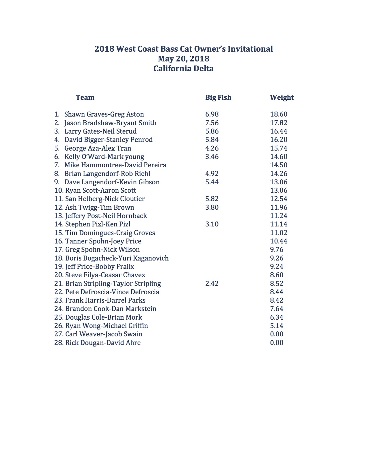 A rough morning ended in a victorious day for the team of Shawn Graves and Greg Aston this past Sunday, May 20 in the 2018 West Coast Bass Cat Owners Invitational hosted by Boatmasters on the California Delta.