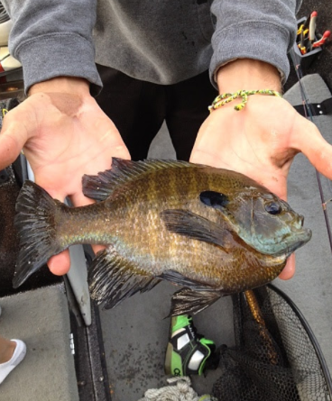 By the time the electrofishing was finished, 2 pumpkinseed sunfish, 8 black crappie, and 30 bluegill were boated. Both pumpkinseeds, the only native fish netted that day, were returned to the water unharmed. The crappie and bluegill were brought back to the lab for analysis.