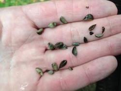Zebra mussels are an invasive (non-native) species that can compete with native species for food and habitat, cut the feet of swimmers, reduce the performance of boat motors, and cause expensive damage to water intake pipes.