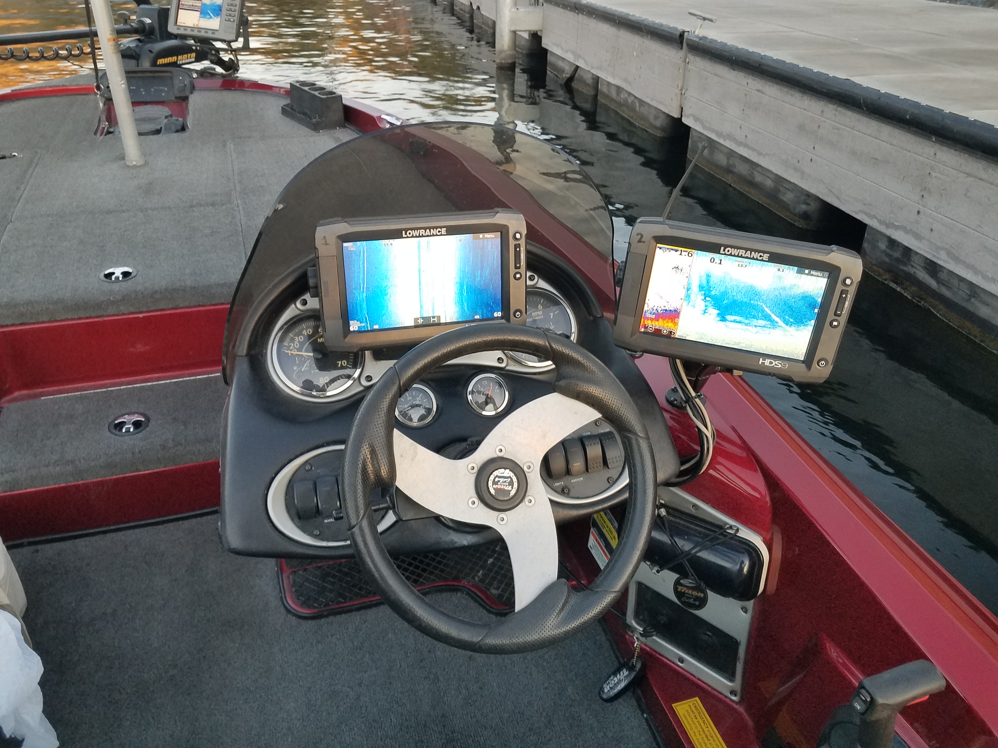 one Lowrance HDS 8 Gen 1 at the bow, two Lowrance HDS 9 Gen 2 touch units at the console with structure scan.