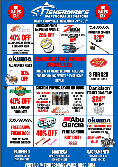 Fisherman's Warehouse reminds us... on top of their Black Friday sales ad there is NO SALES TAX FRIDAY AND SATURDAY AT ALL FISHERMAN'S WAREHOUSE LOCATIONS!