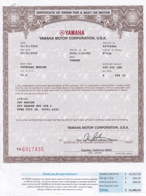 I am selling a near brand new 2024 Yamaha 70 HP 4 Stroke Outboard Boat Motor. It only has 134 hours on the engine. The engine runs perfectly. I need a bigger engine so I am selling this one. I bought the engine new from a Yamaha Boat Dealer in January 2024. I have Yamaha Certificate of Ownership (see photograph in ad). The engine was properly broken in during its first 10 hours. The engine was tuned up at 20 hours and 100 hours by a licensed Yamaha Dealer to valid its 6 year warranty. I have the warrant card and all other dealer paperwork.