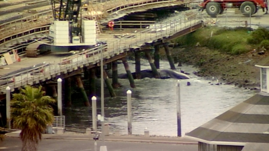 Marine experts say a dead whale was found partially submerged under a bridge in the estuary near Oakland's Jack London Square.