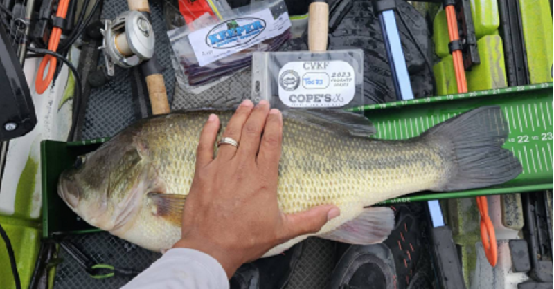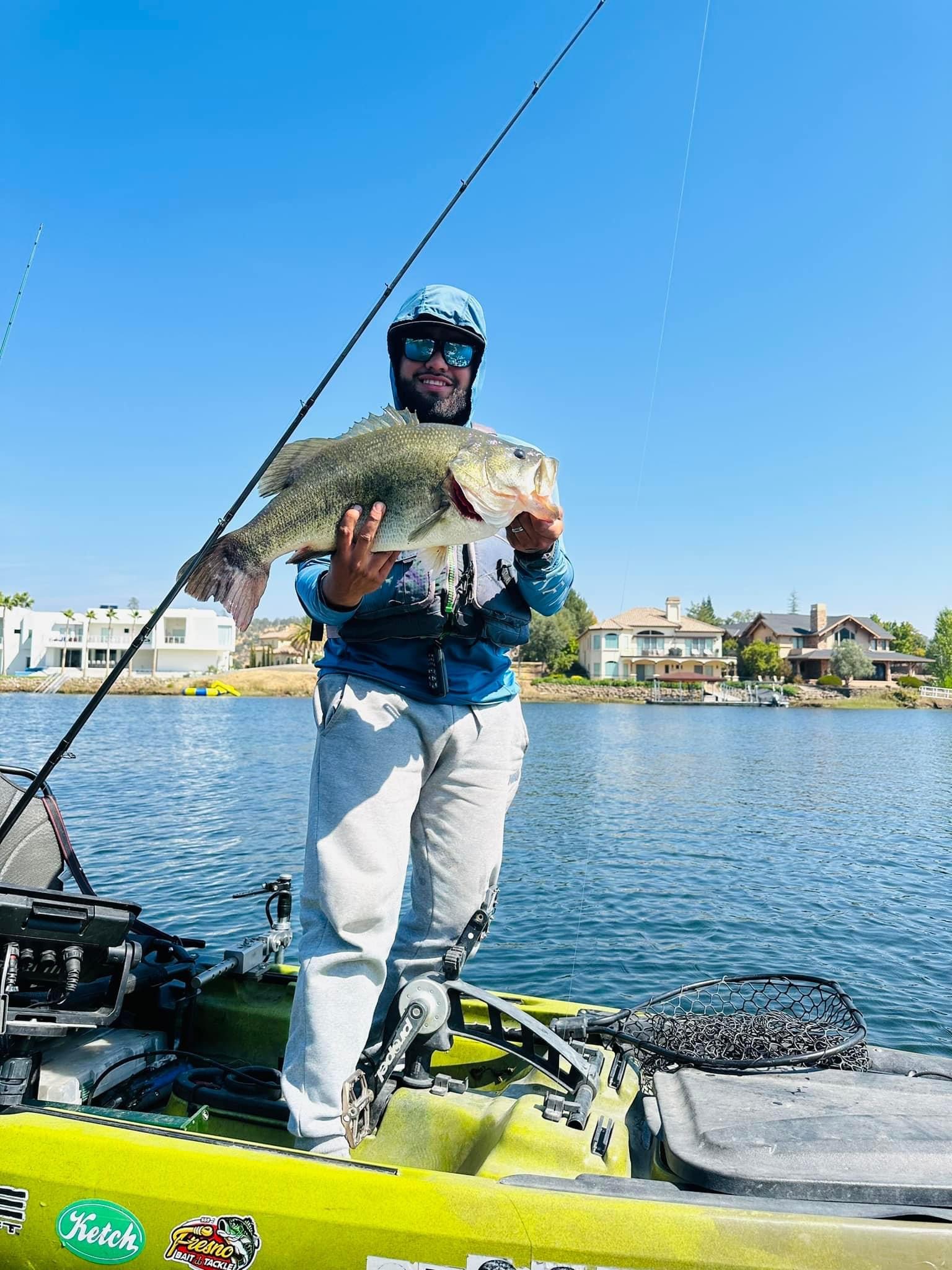 The Central Valley Kayak Fishing held their Tournament of Champions (TOC) at Santa Margarita Lake. The dock talk was a frog bite in the shallow grass and a good top water bite near the steep bluff walls. However, mother nature had other plans with a morning marine fog layer hovering over the lake until almost noon. The weather changes compared to practice days put a wrench in most angler's game plans. One angler that had the best game plan was Angel Sanchez. Angel Sanchez used a magnum spoon to put up an amazing limit of 94.25” besting second place by 9 inches. Sanchez said that he made a long run to the dam area where he worked his spoon to entice his massive 20 lb. limit.