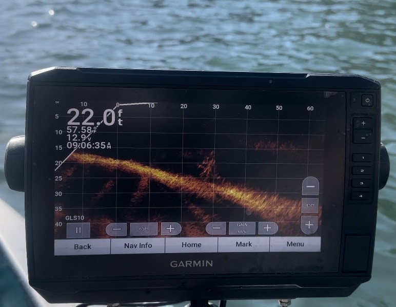 New Melones Lake is an amazing fishery. While interviewing Garcia, it was amazing where he caught his fish. Garcia found one pile of laid down logs that were stacked together in 22 feet of water. He saw the fish on his Garmin Panoptix live scope moving around the structure. (See photo). Garcia used a 3/16-ounce ball head paired with a 2.8” Keitech to catch his impressive limit. He sat on the pile of trees until the fish slowed down and then left for a brief time. Once Garcia returned, he found that the magical spot had been reloaded with another huge school of fish. He fished in the same area that he found a year ago and felt confident that the fish would be there – he was right.
