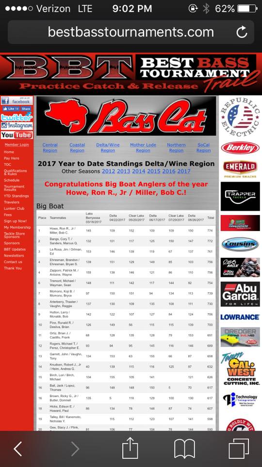 RB BASS Anglers Ron Howe and Bob Miller win 2017 AOY Title in the BBT Delta Wine Region.