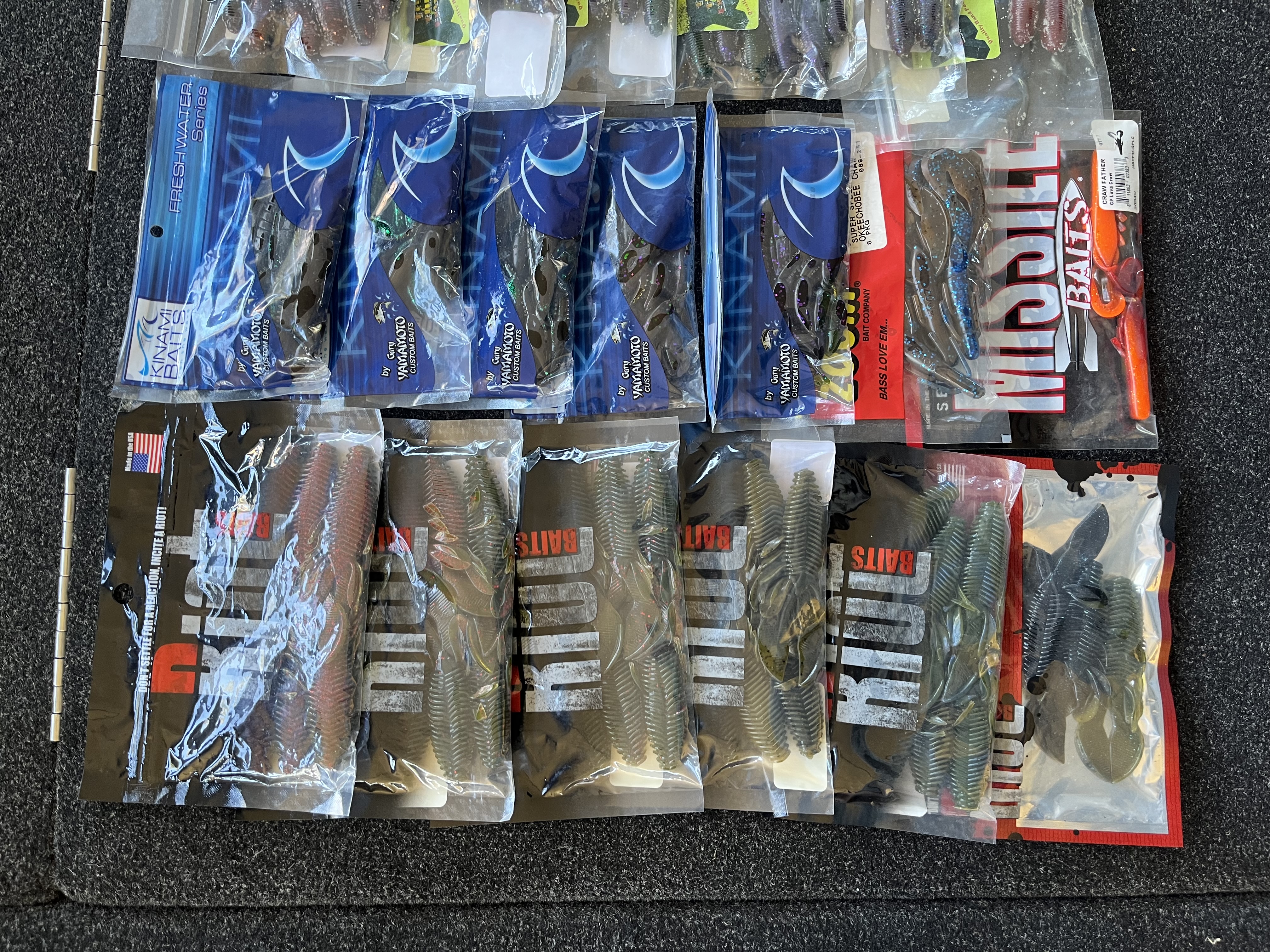 -(25) packs of baits almost all brand new besides a couple. (Riot Beaver, Yamamoto Psycho Dads, D&M Punch Craws, Bass pro Beavers, Zoom, Zipper Worm)