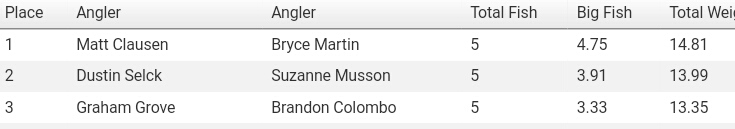 Matt Clausen and Bryce Martin. They took home the win against 39 teams with 14.81lbs. Thank you to all the teams that came out and supported the Coastal Region Opener. For full results go to: http://www.fishbbt.com