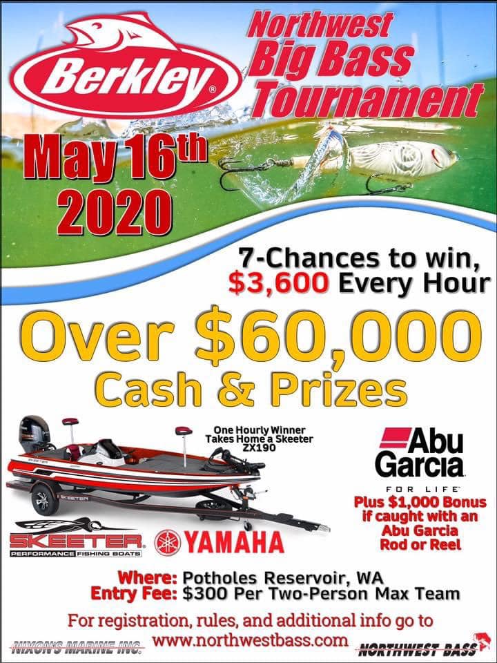 We are excited to announce that the Berkeley Big Bass Tournament IS going to be held AS SCHEDULED! We have a lot of new additions to the event this year including the Berkeley Experience Trailer will be at MarDon’s Resort Thursday May 14th from noon to 6 PM, Friday from 9:00 AM thru the end of the drivers meeting and Saturday Morning 6:00 AM until the final weigh in at 3:00 PM. Come check out the latest products from Berkeley and Abu Garcia. As well the trailer will have tons of Berkley, Abu, Johnson and Sebile products at a substantial discount. We will have several vendors and factory reps on hand to answer any of your questions about their products. We have expanded drawing prizes you must be present to be eligible for from a Humminbird Helix Depth finder to a Nerka Electronics mount and tons of swag items including hats, t-shirts and rods and reels to give away. We will have Hot Dogs and Burgers for $2.00 each as well as $2.00 beverages Friday afternoon and Saturday afternoon. All proceeds will go to the Potholes Habitat fund. MarDon’s will have breakfast and coffee specials Friday and Saturday morning as well. We will be paying cash to the first 5 places each hour this year vs 3 last year. We will also be giving away a 2020 Skeeter ZX 190 powered by a Yamaha 150 SHO, a Minn Kota trolling motor and two Humminbird Helix 5 graphs to one of the 7 hourly winners.