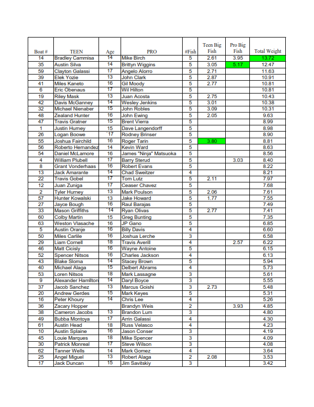 This years Pro-Teen Classic was won by Bradley Cammisa (14) and his pro Mike Birch, each brought a solid fish the scales and sealed the Victory with 13.72. Second Place went to Austin Silva (14) and Brittyn Wiggins with the big fish of the day 5.17, with a total weight of 12.47 AND they caught a tagged stripper earning them a cool 100 bucks. Teen Big Fish honors went to Joshua Fairchild(16) going 3.80 (4 lber on Cooch's Scale) Overall it was a great day in remembrance of our friend and brother Cooch - We hope to see you all there in 2018!