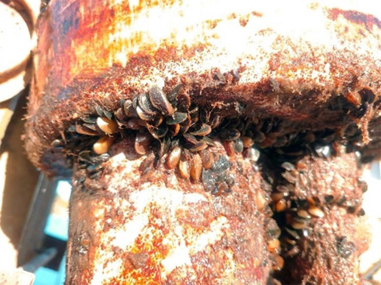 The mussels, or Limnoperna fortunei, originated in Southeast Asia and are a freshwater species that inhabit shallow waters. The mussels colonize hard surfaces such as water intakes, impeding water flow, clogging pipes, and damaging equipment, including boat motors.