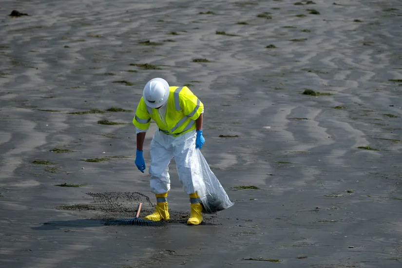 A worker in protective suit cleans the contaminated beach after an oil spill in Newport Beach, Calif., on Wednesday, Oct. 6, 2021.