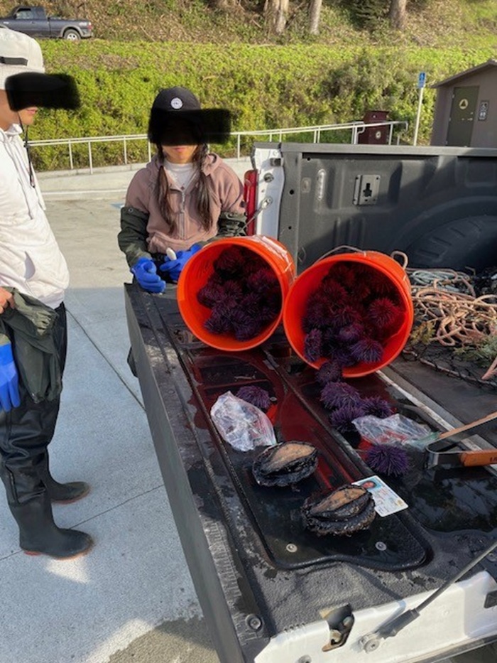 Over the weekend, a wildlife officer was using a spotting scope to observe two individuals at Van Damme State Park. The officer watched a male and female in the intertidal zone taking purple sea urchins when he observed the female discreetly conceal what appeared to be an abalone down her pants, an unconventional storage method, to say the least.