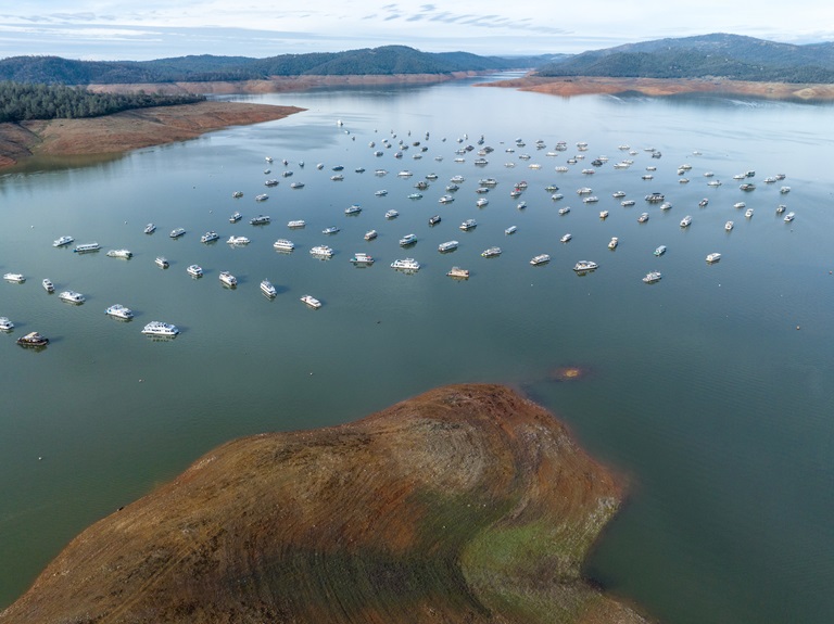 A drone view of low water conditions at the Bidwell Canyon Marina located at Lake Oroville in Butte County, California. On this date, the water storage was 1,790,095 acre-feet (AF), 51 percent of the total capacity. Photo taken January 12, 2022.