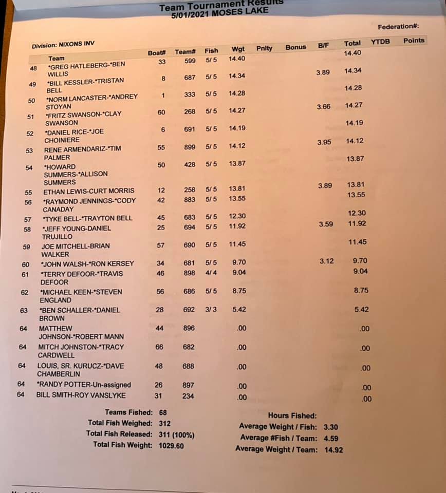 Here are results from day 1 of the 13th Annual Nixon’s Invitational!! Good luck to top 10 fishing today for $10,000 first place prize. 3pm Live Weigh in