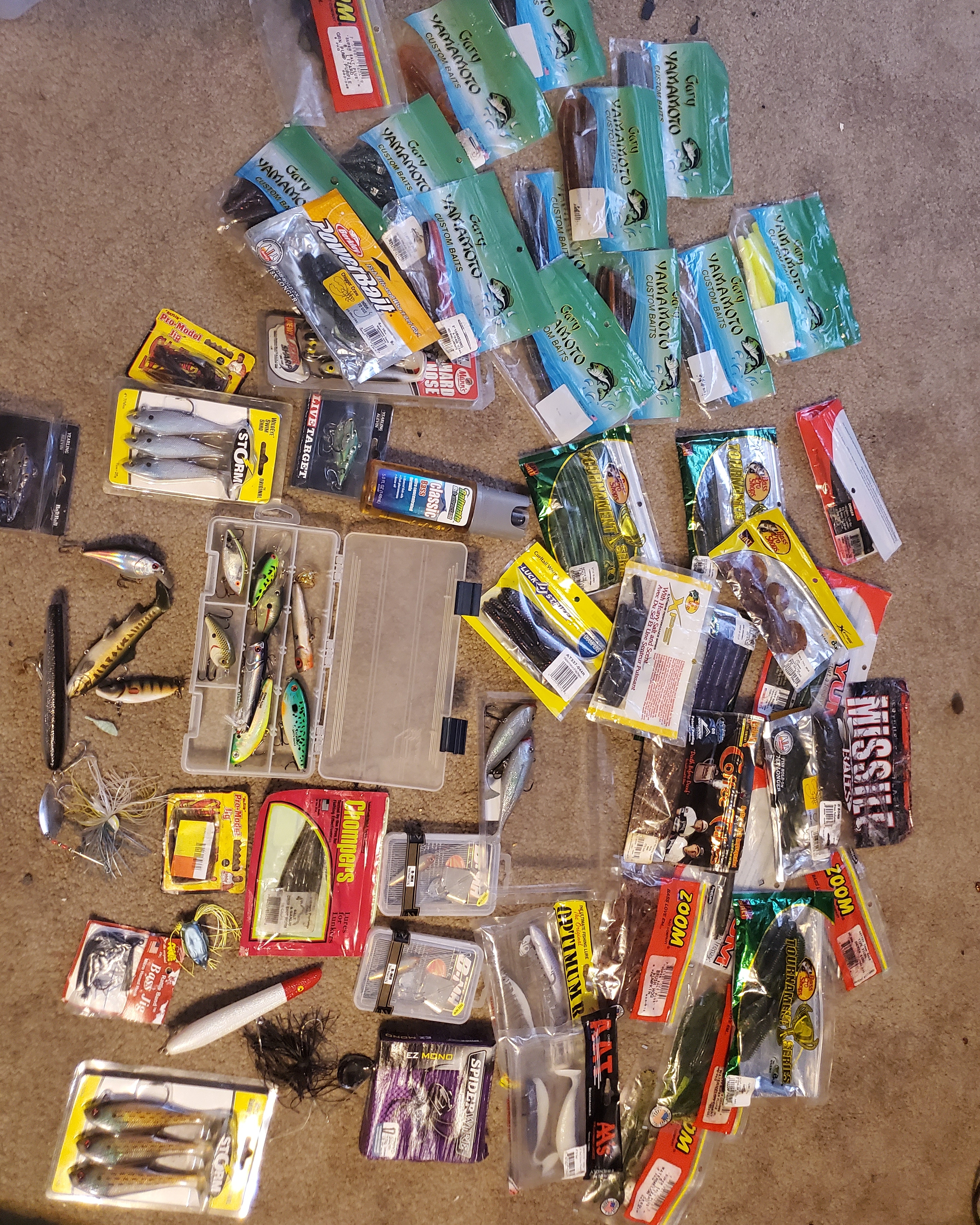 Have 40 packs of soft plastics, 14 are senkos, and miscellaneous tackle pictured, Also included is 3 brand new rods.