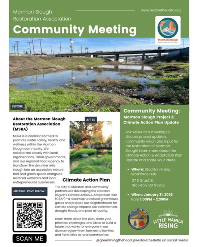 Join MSRA alongside Little Manila Rising and Greenlining the Hood for a community conversation about the future of Mormon Slough and Stockton's Climate Action & Adaptation Plan (CAAP). Learn about project updates, share your vision, and help shape solutions that protect our communities from climate impacts like extreme heat, drought, flooding, and poor air quality. Use your voice and join us to build a future that works for everyone across our diverse region.