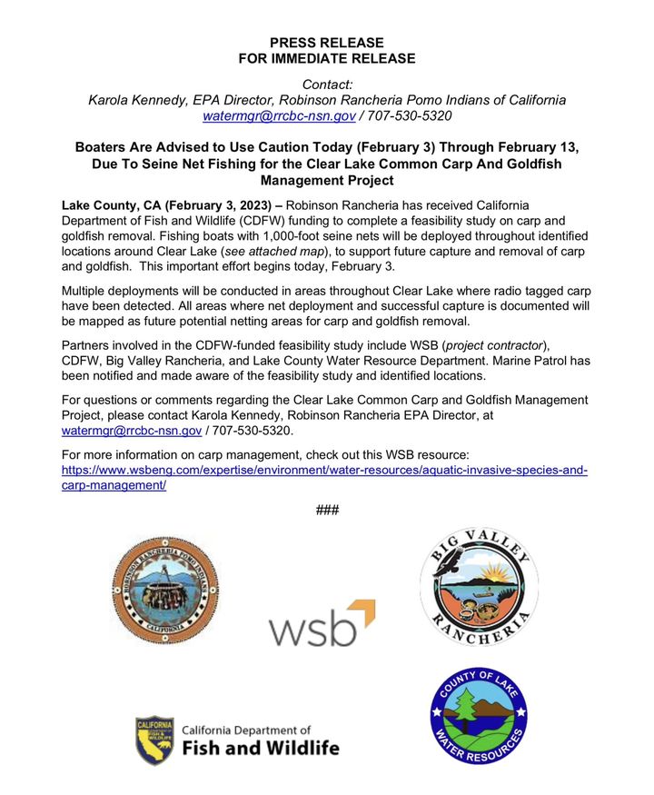 Lake County, CA (February 3, 2023) – Robinson Rancheria has received California Department of Fish and Wildlife funding to complete a feasibility study on carp and goldfish removal. Fishing boats with 1,000-foot seine nets will be deployed throughout identified locations around Clear Lake (see attached map), to support future capture and removal of carp and goldfish. This important effort begins today, February 3.