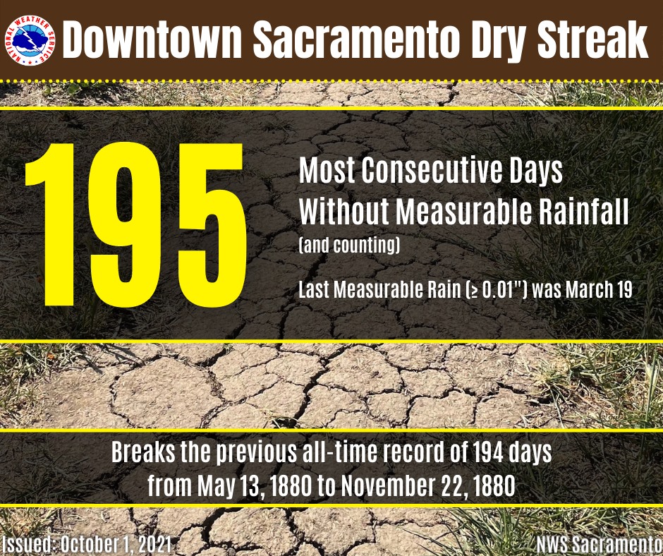 As of midnight Oct 1, the Downtown Sacramento climate station has gone 195 days without measurable rain.