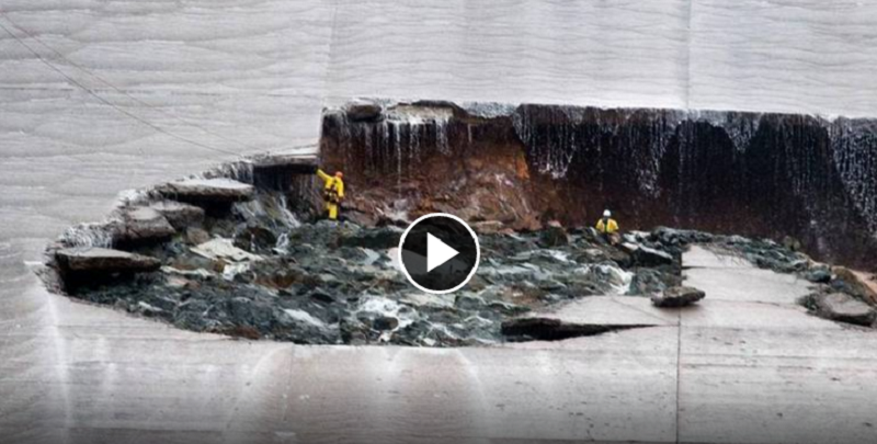 Officials said they have three or four days before they have to start letting the water spill again. If and when they do, the hole, estimated 180 feet wide by 250 feet long and 30 feet deep, will likely get bigger.