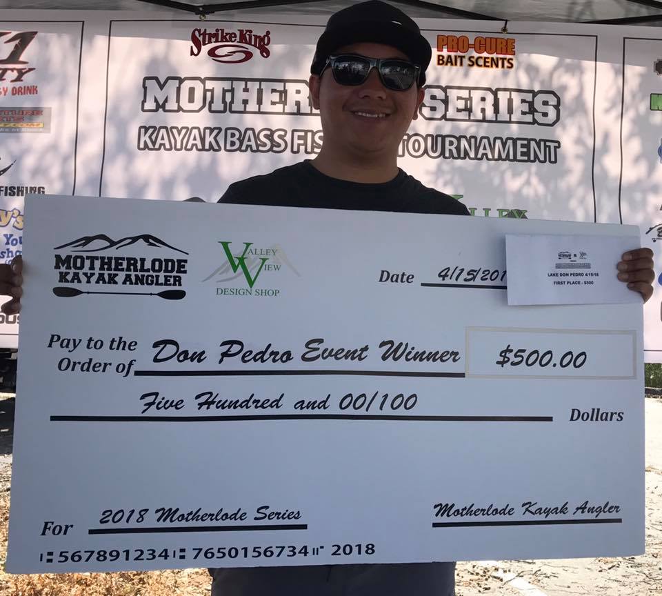 When he put the fish on the board it measured out at 20.5" and he reported he was "pumped". He was not expecting to win the tournament as he was on 15" fish in pre-fish. He took some advice from a good friend on where to fish and then followed his instincts to ultimately be crowned the 2018 MKA Motherlode Series Lake Don Pedro Champion and qualifed to fish the 2018 MKA Motherlode Series TOC on Kelsey Bass Ranch on 5/12/18.