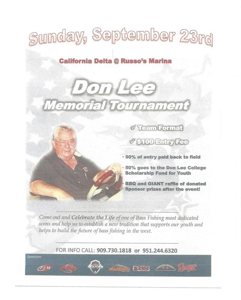 Let's get some boats signed up for the Don Lee Memorial Tournament at Russo's Marina on the California Delta. There will be a big raffle along with a free bbq all to raise money for the High School Scholarships for two young anglers and to pay tribute to Don Lee our Ranger Boats rep for the 30 years here in the west that did so much.
