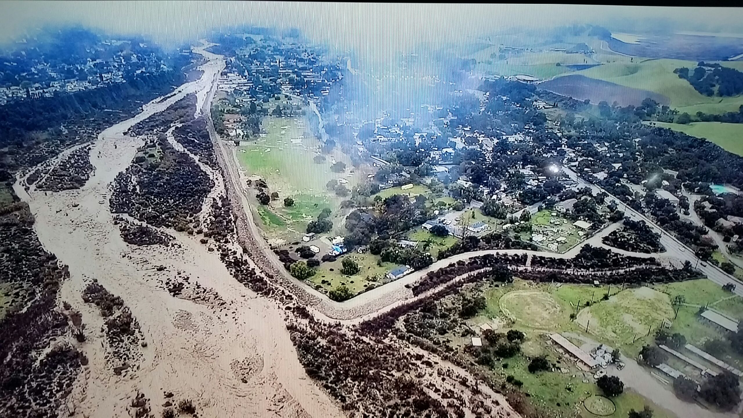 gosh those pesky steelhead screens need to be cleaned I'll wager ...HOWEVER: The water from Santa Anna Creek is over the bridge into the campground a bit and the creeks and burned away hillsides are pouring in some water. Heaven knows they have tried to keep the water out but it's flowing in anyway.Let's see today's video of the canal Vs. the river. When you see what is flowing by my house you can only be depressed that it's on it's way to the sea Vs. being put to good use. Cachuma will be the one that really benefits from this type of storm. I heard that they got 1/2 an inch in 3 minutes at Gaviota. I'm close to 17 inches since the beginning of December...Last year about this time maybe 1 1/2. It's going well enough that they won't be able to close it this year. HA Ha