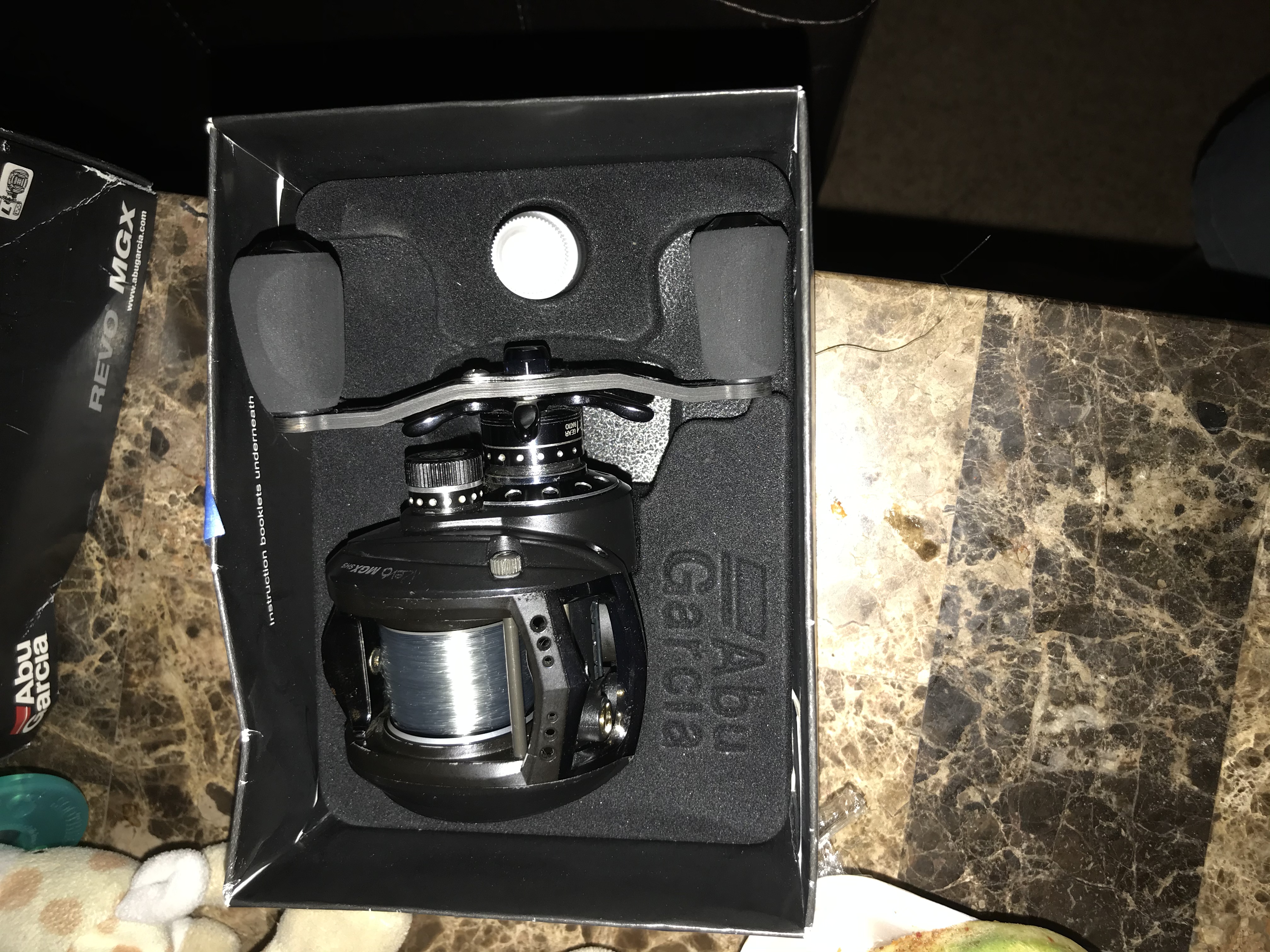 Used left handed reel.. was just serviced by Abu Garcia. The reel will come with everything plus the oil.. the reel has a up graded 110 mm handle along with the stock that’s in the box. The reel is spool up with 12 lb sunline fc sniper. Sold!!!!!!