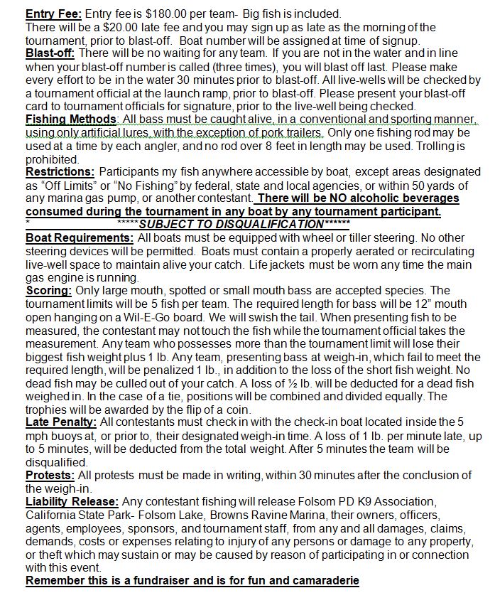 As promised, here is the Folsom Police K9 Association entry form for their tournament on April 11, 2021 at Folsom Lake, Browns Ravine. There is a very good raffle after and competators get lunch provided. Get your entry in as your boat number will be assigned in order of sign ups. All the information is attached and sign ups start now. This is a fund raiser for the Folsom Police K9 Association. It is open to current or retired Police, Sheriff, Corrections, Fire personnel, paramedics and and is also open to the general public. $180 gets you entered including big fish. There will be cash prizes awarded and trophies or plaques.