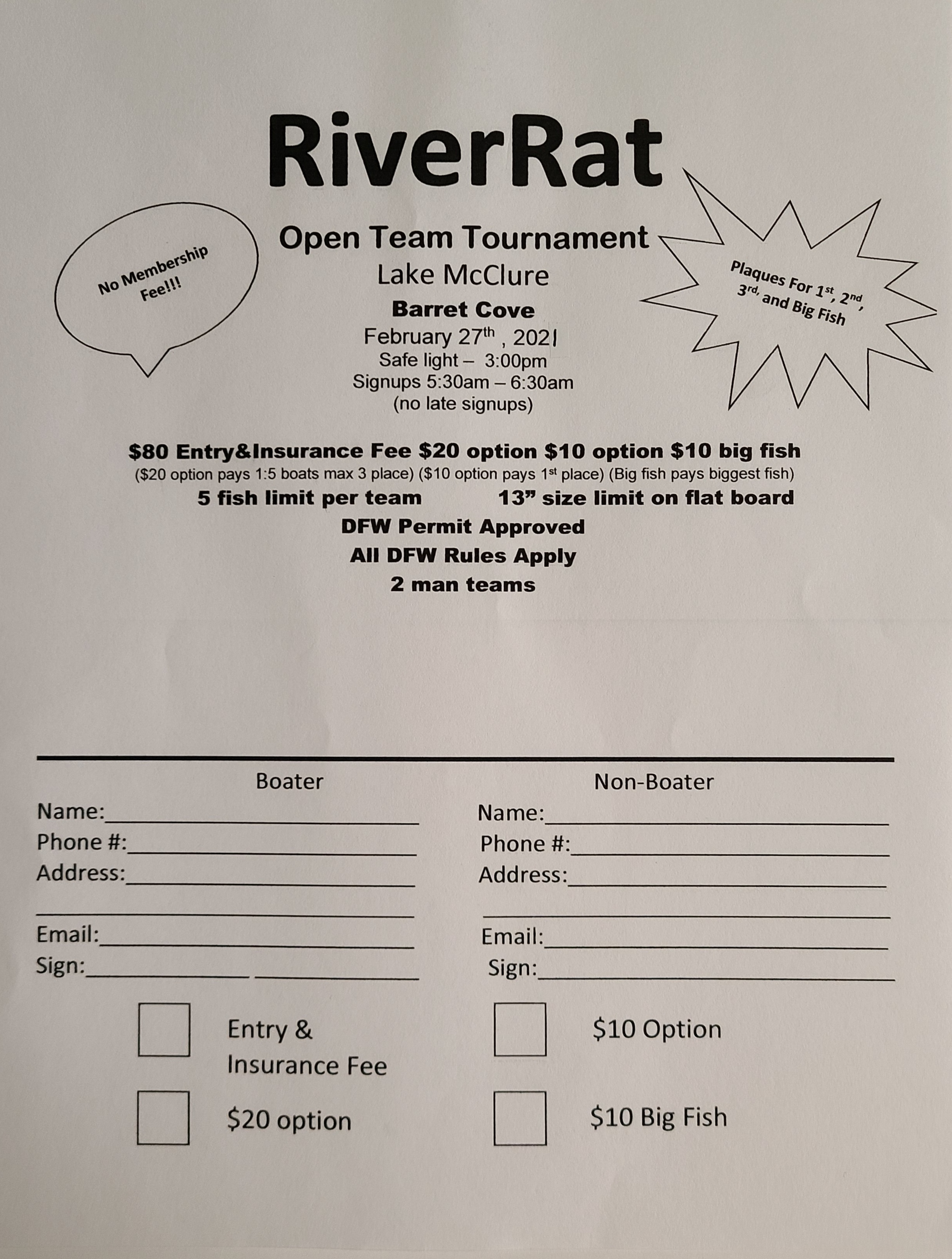 RiverRat Open Team Tournament at Lake McClure on Saturday Feb. 27,2021 "NO MEMBERSHIP FEE" Go out Barret Cove