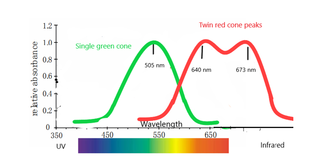 The LMB can see red fairly well (like us) along with some orange. Then follows a bit of a gap between green and red. Then the LMB eye response drops to zip.