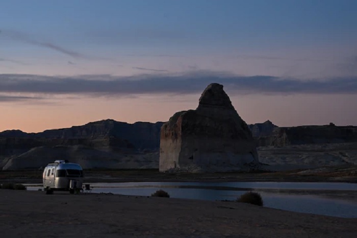 A camper parked along Lake Powell in Big Water, Utah. Scientists fear the lake's water level could reach a low that would make power generation at Glen Canyon Dam halt. (Joshua Lott/The Washington Post)