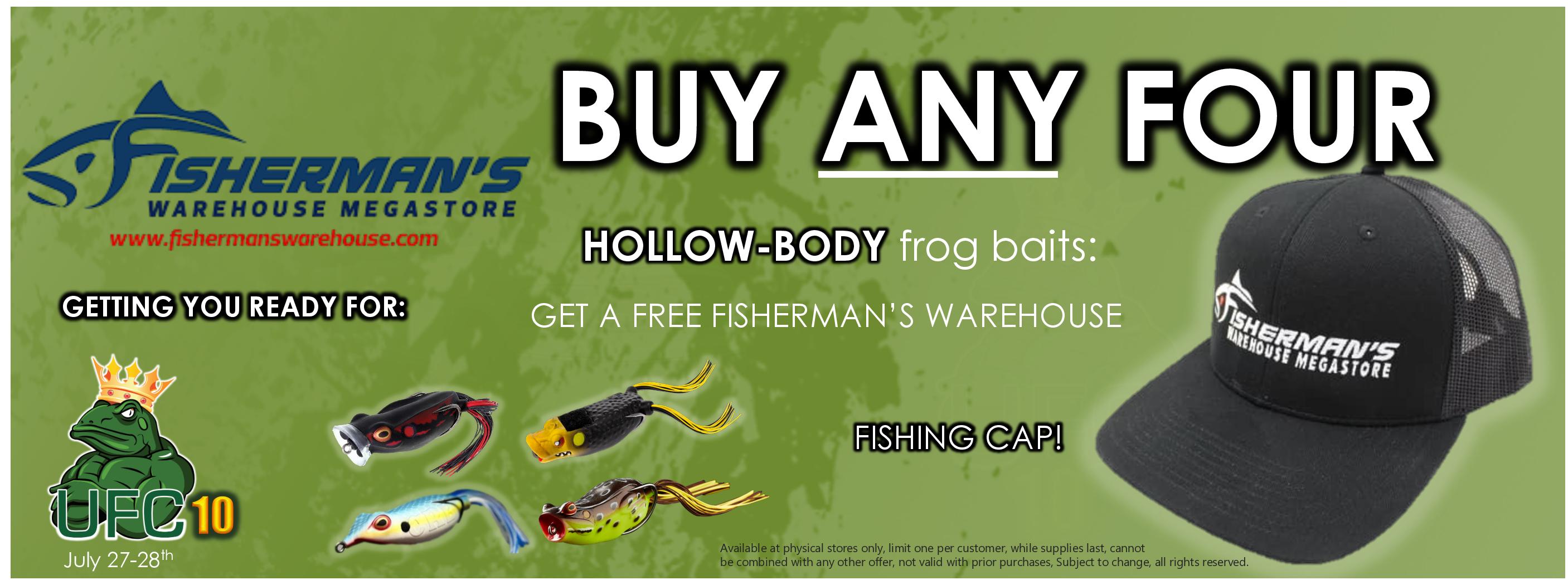 Buy ANY FOUR hollow-belly topwater frog baits at any of the 4 Fisherman's Warehouse store locations, and receive a FREE Fisherman's Warehouse cap!
