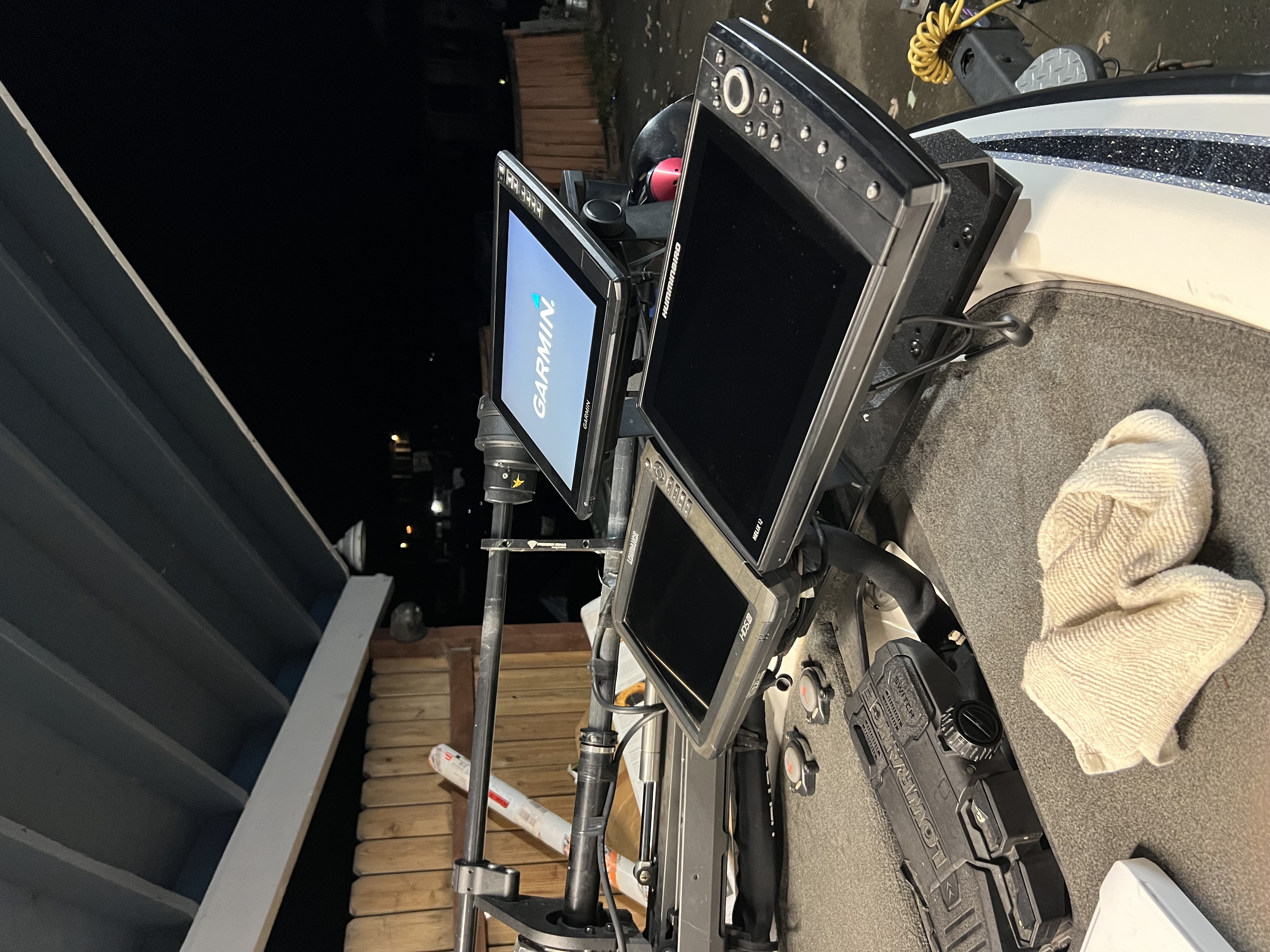 At the front - Lowrance 12" HDS for down scan and map connected to console. Garmin 12" Echomap w/ LVS34