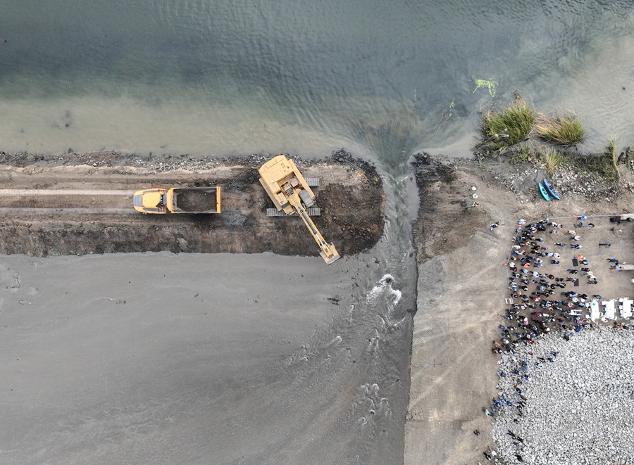 Today’s levee breaching ceremony featured speakers from the Solano County Board of Supervisors, EIP, DWR, and the California Natural Resources Agency. Following remarks, attendees watched as an excavator breached the levee on the southeastern end of the site, allowing tidal waters to flow in. This is one of nine total breaches that will occur on the eastern edge of the project. Today’s breach removed 600-feet of dirt from the old levee and is the largest of the nine breaches.