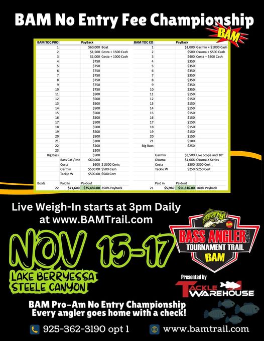 BAM Pro-Am "No Entry Fee" Championship is this weekend at Lake Berryessa
