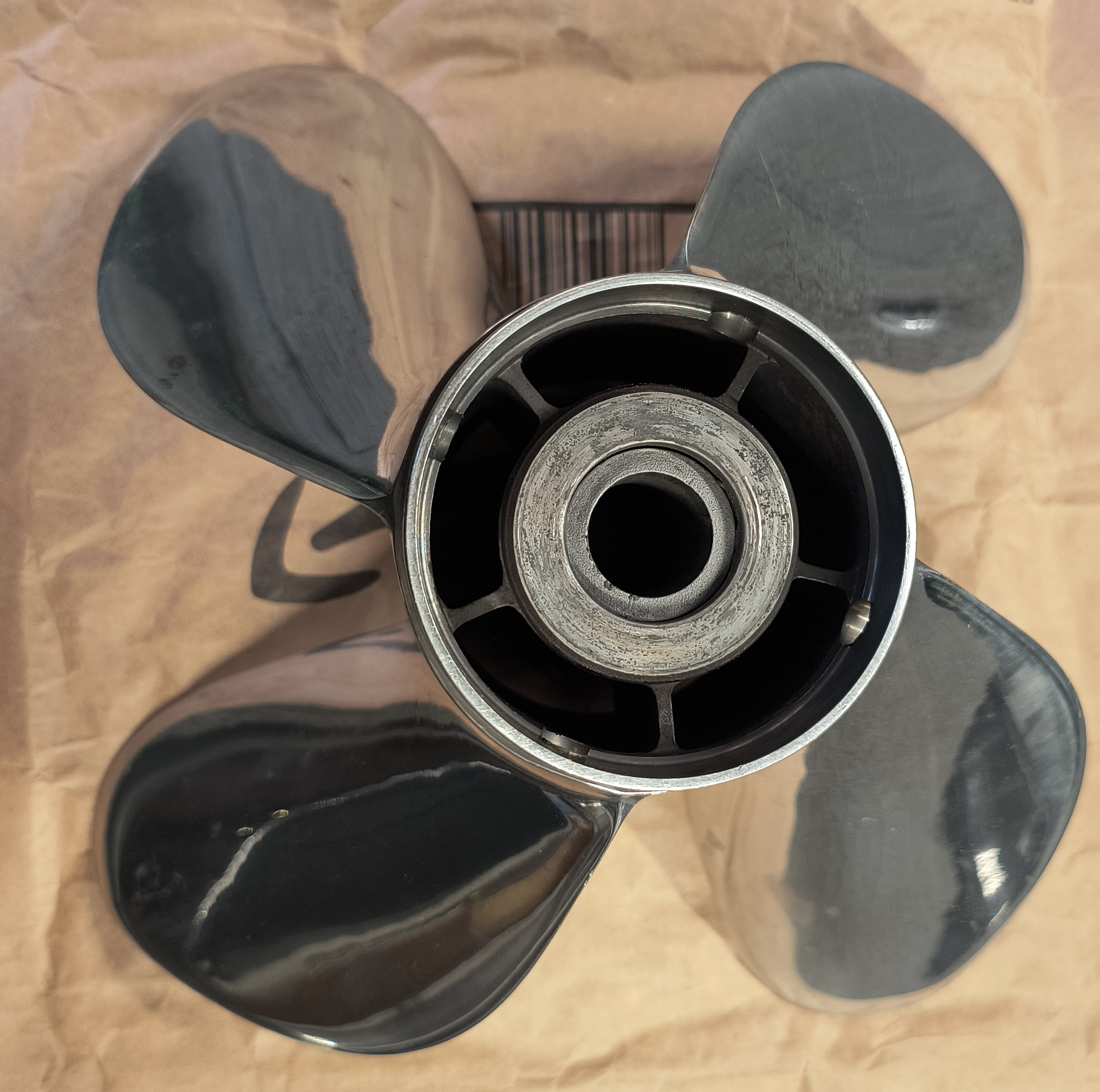 Thru-Hub Exhaust or Over hub exhaust (requires ring for over), Cushion Loc & Square Insert Hub available, High Rake Excellent Lift, Similar to Mercury Trophy, High Polish Finish. Hub included. SOLD